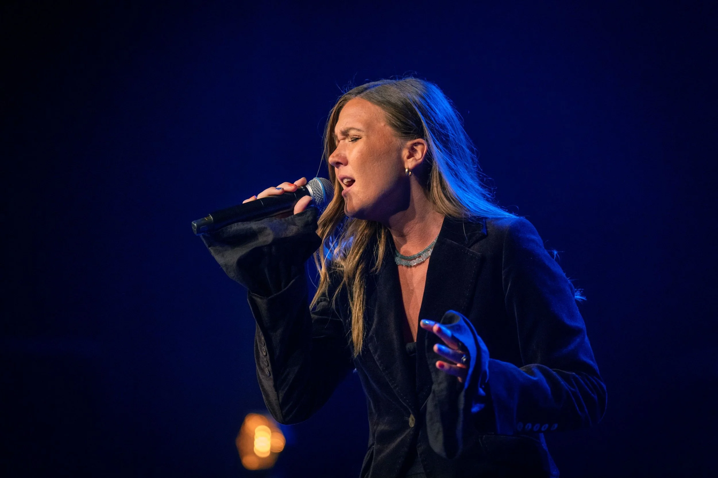 Marlen Tjøsvoll underholdt med sang fra scenen under middagen.