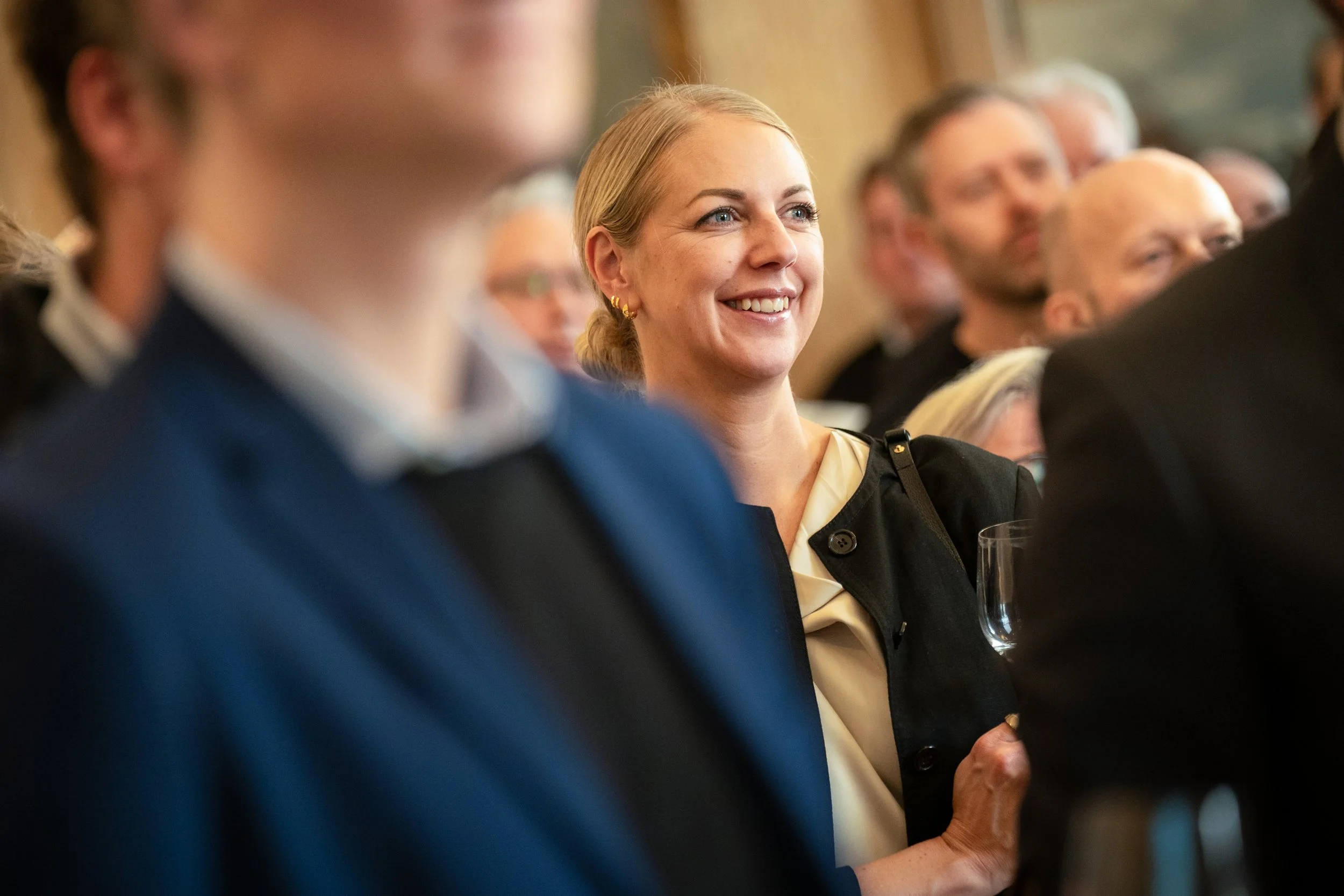 Liv Reidun Grimstvedt (i midten) fra Høgskulen på Vestlandet var en av flere fra campus Haugesund som deltok på “kanapeer, kultur og kapitalisme” den 9. januar. Foto Grethe Nygaard/Maritimt Forum.