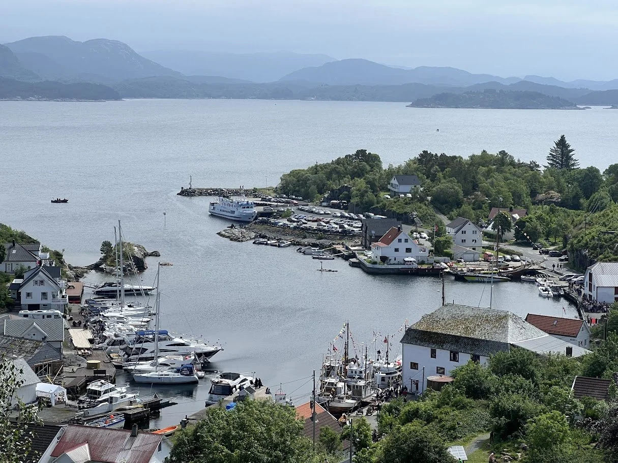 Mosterhamn i 2024, fortsatt med eldre fraktefartøy innerst i vågen. Foto SMe.