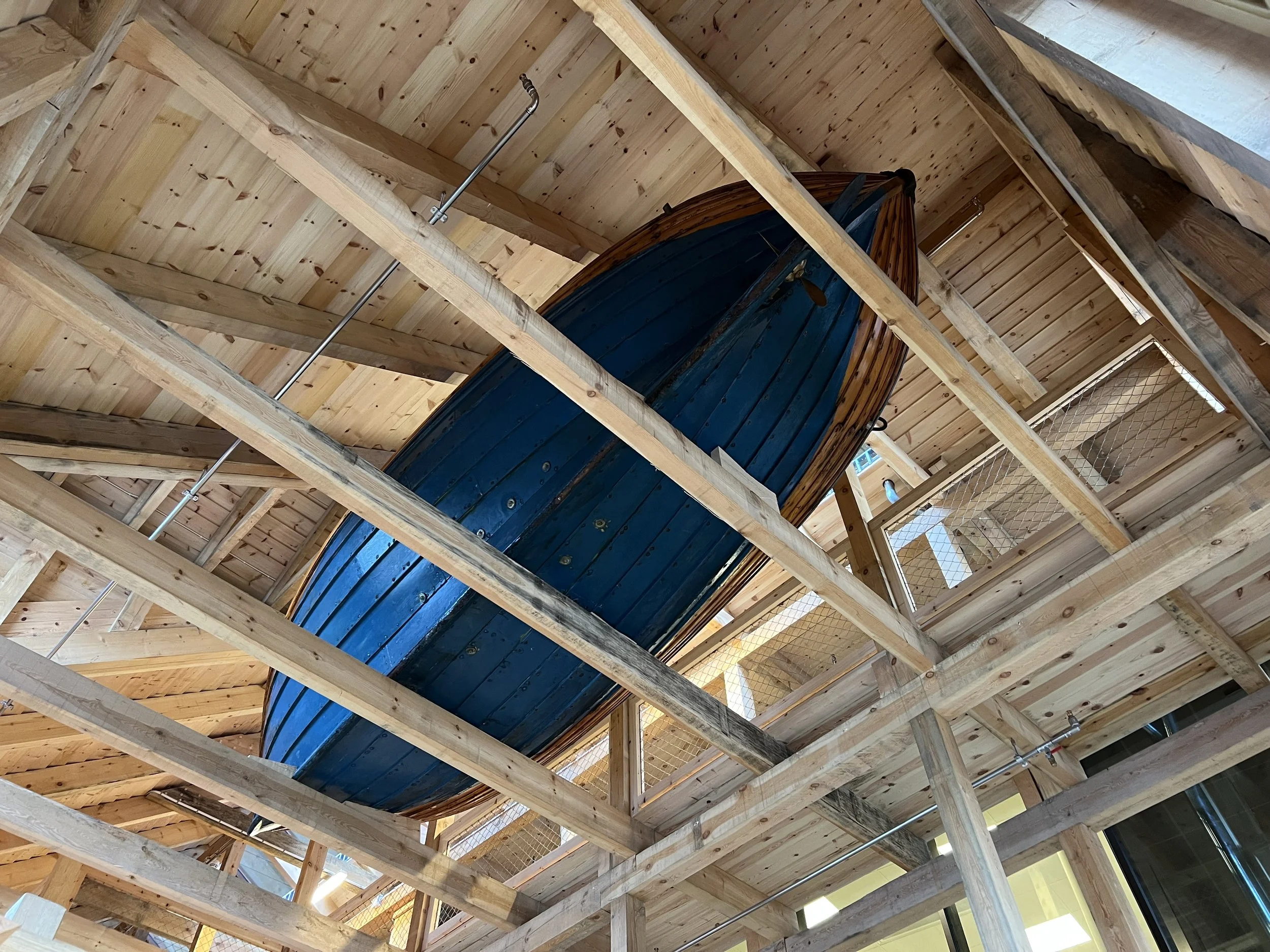 Kristian Eidesvik arbeidet for å realisere planene for Smedasundet 77 i 20 år. Han fikk ikke selv oppleve åpningen, men han levde lenge nok til å kunne glede seg over hvilket praktbygg som ville stå ferdig om kort tid. Her er den første båten hans montert i sjøhuset som utgjør en del av Smedasundet 77 sin fasade mot sundet og hvor gående kan følge sin vei langs byens livsnerve.