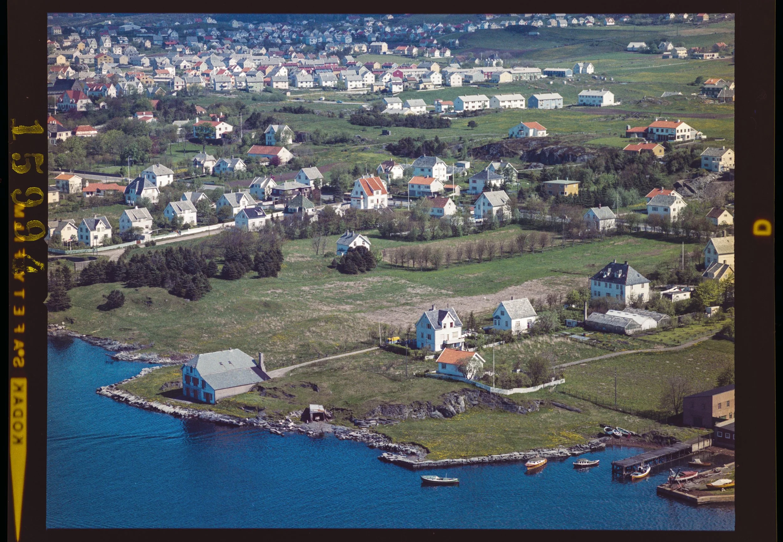 Tveitahuset ytterst mot Karmsundet i 1961. Dette var like forut for at området ble utviklet til maritime skoleformål med utgangspunkt i et tomteareale gitt av Haugesund Rederiforening. Maskinistskolen flyttet hit i 1965, kokk- og stuertskolen i 1968 og Haugesund Navigasjonsskole i 1982. Foto Rogaland Fylkeskommune.