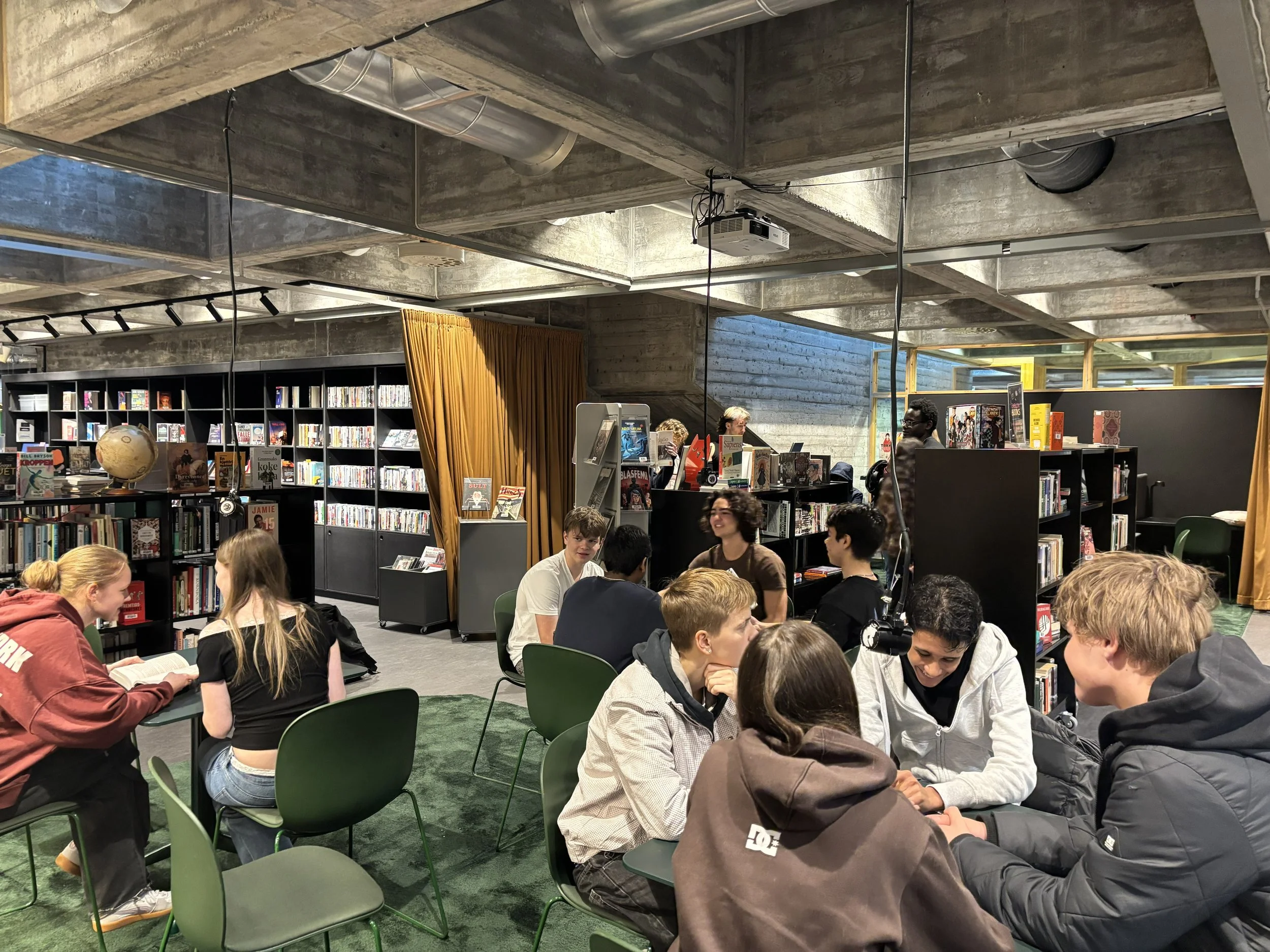 IB-elever Vg2 i arbeid i biblioteket til Vardafjell v. skole. Foto Vardafjell v. skole.