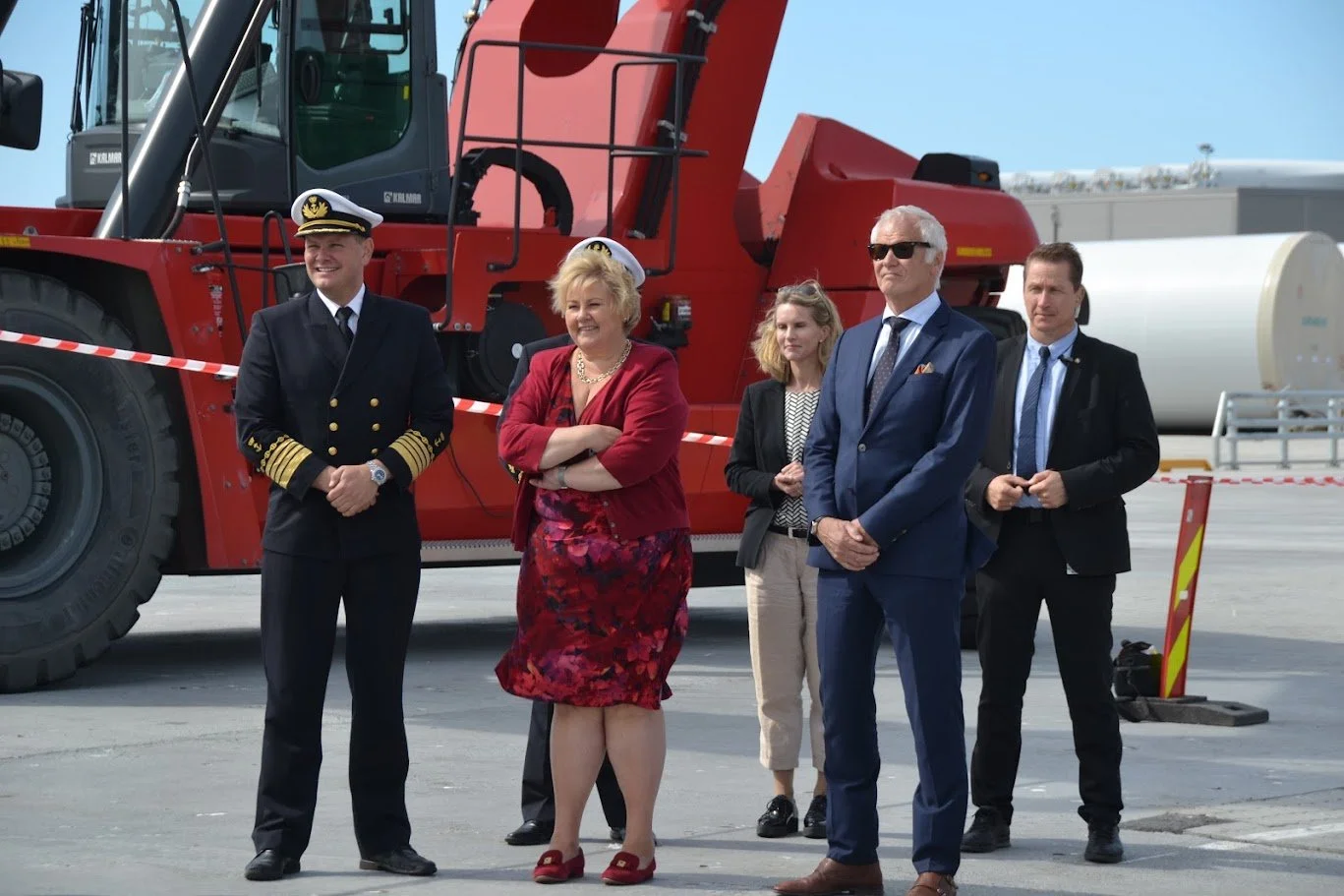 Statsministeren i 2019, Erna Solberg, under åpningen av Haugesund Cargo Terminals på Husøy dette året. T.v. for Solberg, daværende havnedirektør Tore Gautesen og t.h. for Solberg daværende styreleder i Karmsund Havn, Johan Rokstad.