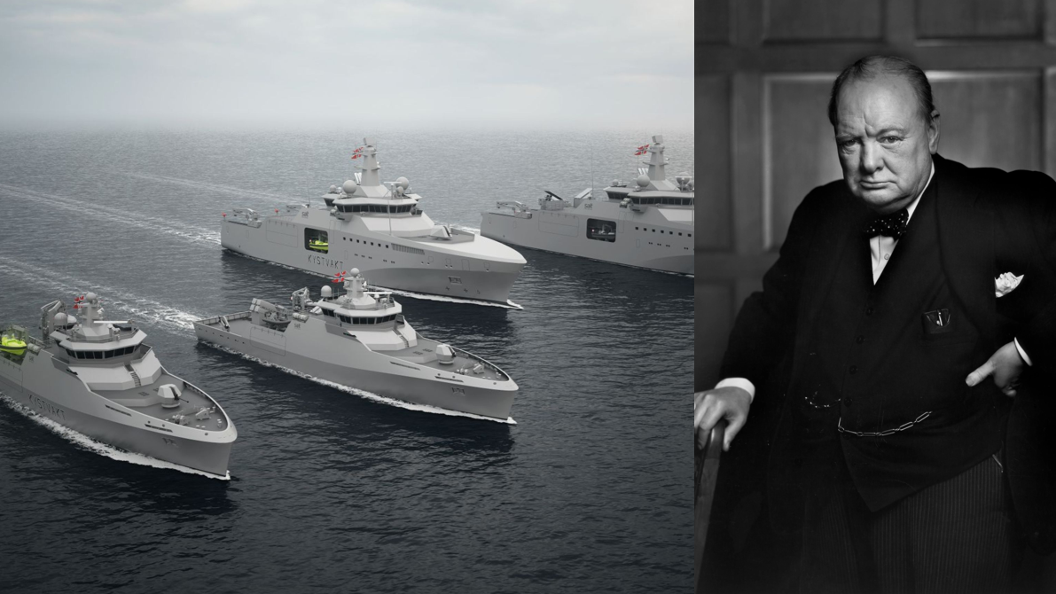 T.v.: Eksempelbilde fra Salt & KDA. Det er ikke selve designet som er valgt, men designer. Nå begynner jobben med å ta frem det endelige sammen med Forsvarsmateriell og Sjøforsvaret. Illustrasjon: Salt & KDA. T.h.: Winston Churchill (Wikipedia).