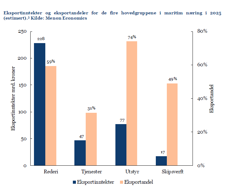 Eksporten fra norsk maritim industri (utstyrsprodusenter, tjenesteleverandører og skipsverft) har økt markant, fra 81 milliarder kroner i 2021 til anslåtte 141 milliarder i 2025. Dette tilsvarende en samlet vekst på 73 prosent.