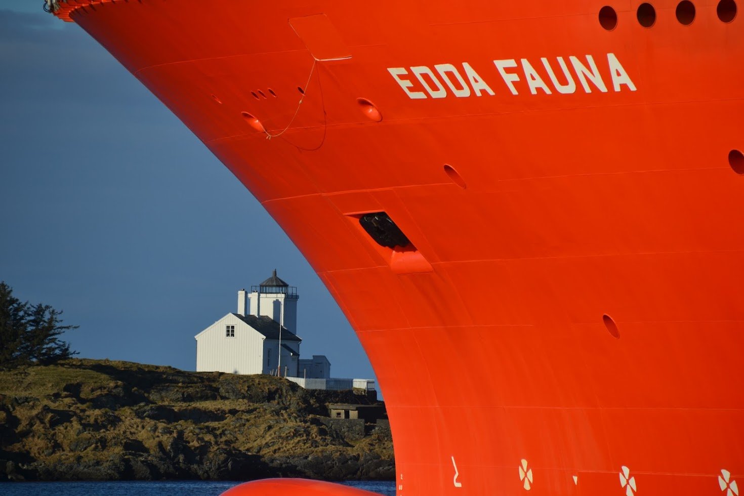 Tonjer fyr sett fra Hasseløy med Østensjø Rederis Edda Fauna i forgrunnen for kai på Killingøy.