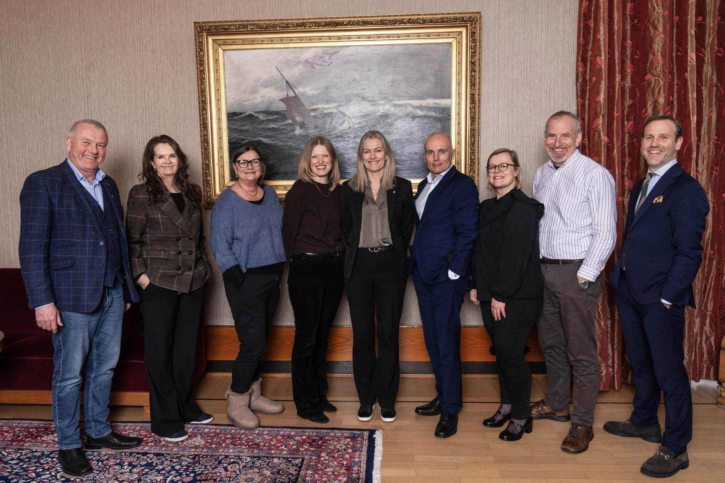 F.v. Daglig leder i Maritimt Forum for Haugalandet og Sunnhordland, Sverre Meling, styremedlemmene Helga Cotgrove og Ruth Eriksen, nestleder i styret, Kristine Skeie, stortingsrepresentant Ruth Mariann Hop, styreleder Runar Skarstein og styremedlemmene Jorunn Steensnæs, Øystein Matre og Nils Konrad Bua. Styremedlemmene Håkon Sandvold og Gunnar Amland var ikke til stede da bildet ble tatt. Foto Maritimt Forum/Grethe Nygaard.