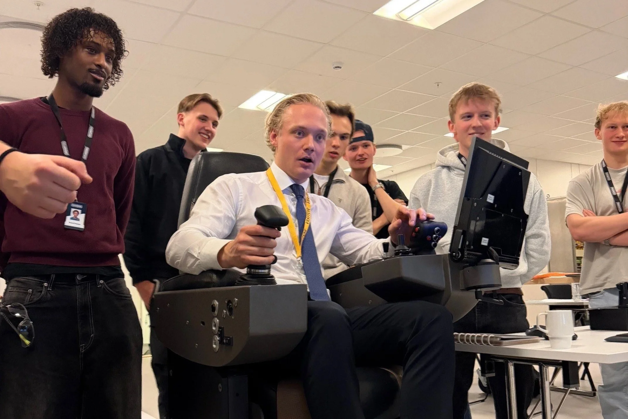 Besøket ble også praktisk. Simen Velle fikk selv teste en av selskapets ROV-simulatorer – den samme typen treningsutstyr som brukes for å utdanne fremtidens ROV-piloter.
