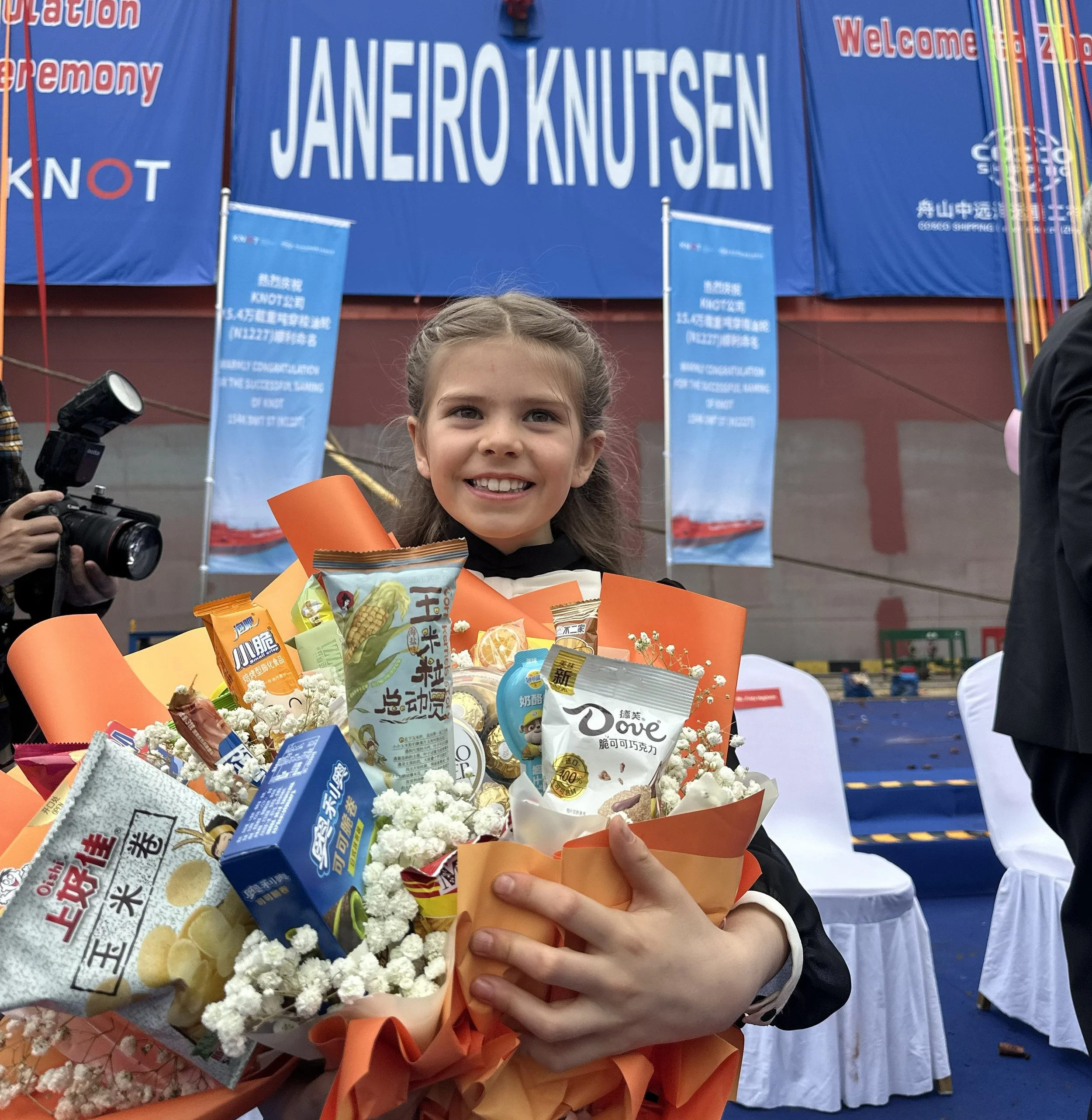 Frida Seglem Høgheim var stolt gudmor da Knutsens bøyelaster Janeiro Knutsen ble døpt i Kina den 14. april.